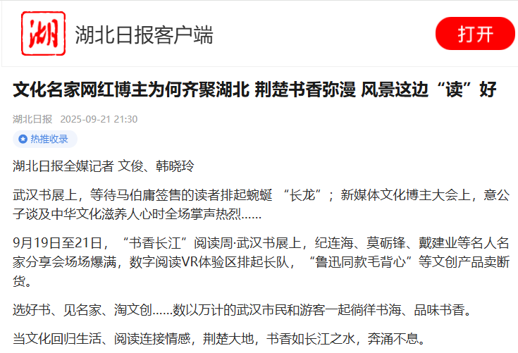 中國新聞出版廣電報 |“書香長江”閱讀周·武漢書展開幕 2025/09/20
