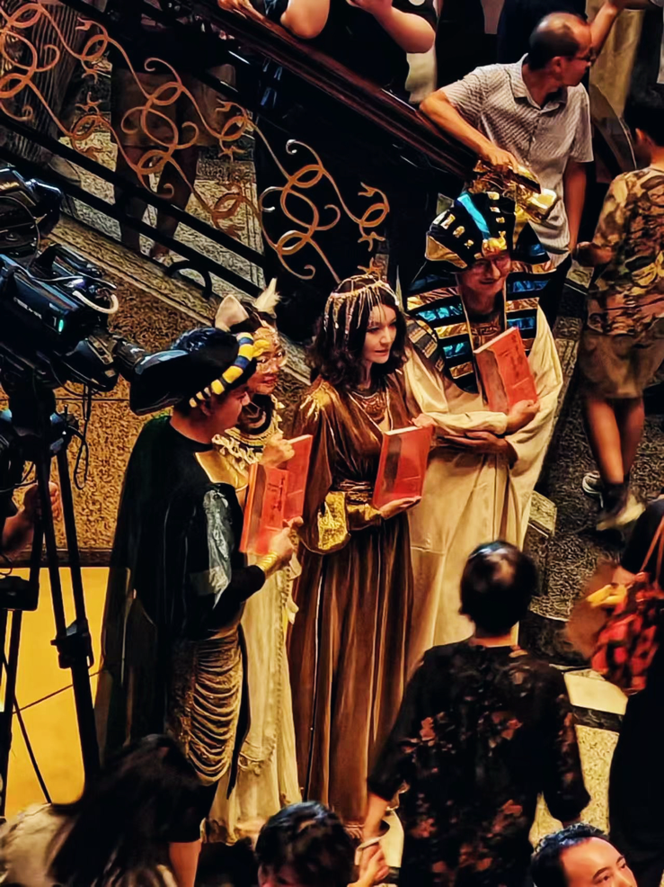8月11日晚,新書在上博嘉年華現(xiàn)場首發(fā)。我社4位同事裝扮成古埃及法老與艷后的模樣,手捧新書,穿行于博物館大廳。我們不只是形象吸引眼球,更成為這本書的“活體名片”。不斷有觀眾好奇地走近、合影,舉起手機拍攝的同時,也頻頻詢問書的內(nèi)容。當(dāng)鏡頭一次次對準(zhǔn)我們,我清晰地感受到一股混合著興奮與成就感的暖流涌上心頭。而將現(xiàn)場氛圍推向高潮的,是博物館館長親筆簽名的時刻。長長的購書隊伍在展廳內(nèi)蜿蜒開來,這是對我們所有努力最直接、也最動人的回應(yīng)。