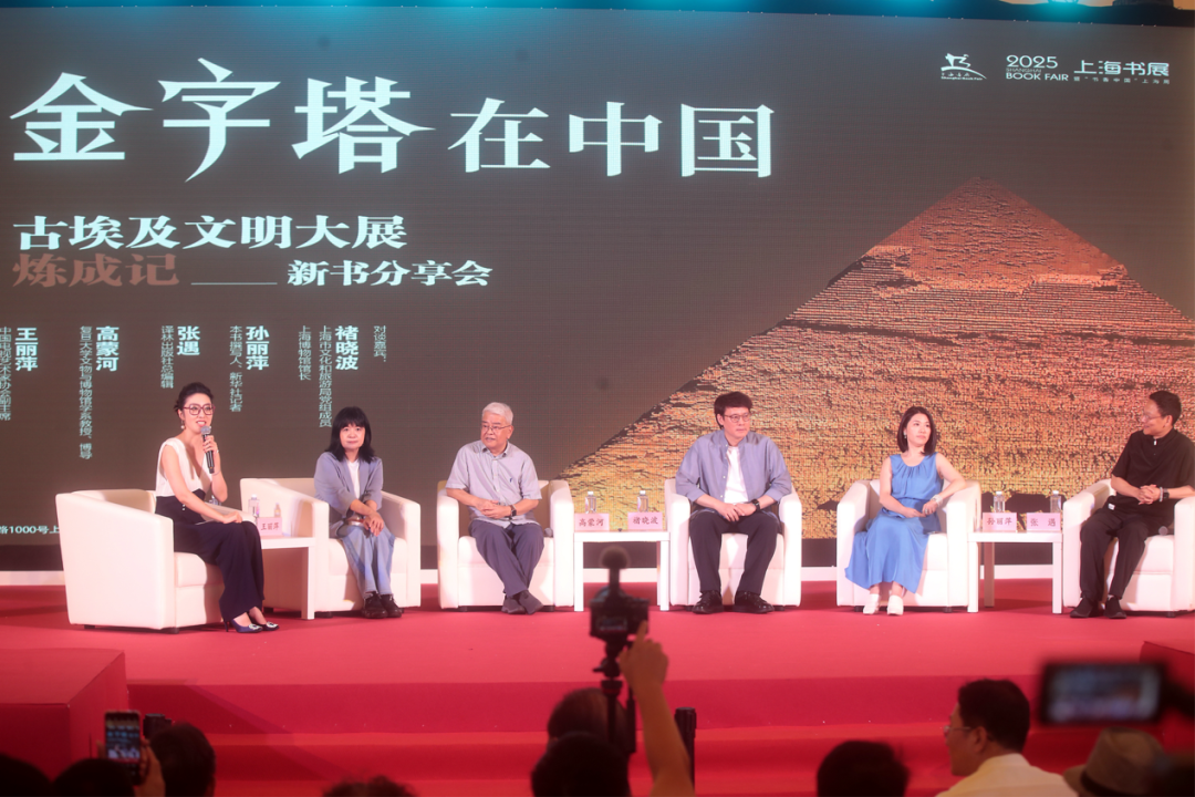 如果說首發(fā)式成功點燃了讀者的熱情,那么兩天后的新書分享會,則真正實現(xiàn)了“破圈”傳播。8月13日晚,上海書展現(xiàn)場迎來了這場以《金字塔在中國》為核心的對談。我們特別邀約了博物館館長、本書作者、出版社總編輯,并匯聚了高校文博系教授與知名編劇,共同圍繞“金字塔之巔:古埃及文明大展”這一現(xiàn)象級展覽,展開了一場跨領(lǐng)域?qū)υ?。嘉賓們不僅回顧了大展從策劃到落地的幕后點滴,更從多元視角探討了文明交流與互鑒在當(dāng)下的深刻意義。整場活動既是一次圖書的推廣,更成為一場融合歷史、文化與公共記憶的思想盛宴。