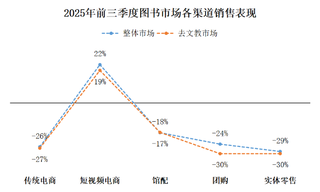 2025年前三季度整體圖書市場中,各渠道占比呈現(xiàn)穩(wěn)定格局。其中,傳統(tǒng)電商和短視頻電商渠道占比接近1:1,二者共同構(gòu)成圖書市場的核心銷售渠道,在整體市場份額中占據(jù)主導(dǎo)地位。