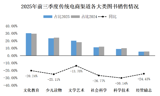 短視頻電商渠道在經(jīng)歷前期高速擴張期后,當(dāng)前市場成熟度顯著提升,整體短視頻渠道基本形成“一超多強”的競爭態(tài)勢,在2025年的增速基本保持在20%左右。從各大類圖書銷售表現(xiàn)來看,僅經(jīng)管勵志類同比微降,但降幅較上半年時顯著收窄,其余各大類圖書均呈現(xiàn)正增長的勢態(tài),且文教、少兒和文藝類圖書增幅進一步擴大。