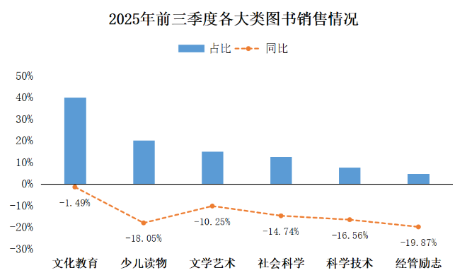 2025年前三季度,圖書市場各大類圖書仍然呈現(xiàn)下降趨勢,且除文藝類、經(jīng)管類外,其余品類降幅均有所擴大。其中,文藝類降幅較上半年略有所收窄,主要是得益于部分新品如《啟示路》、《盜墓筆記(長白山紀(jì)念版)》的熱銷拉動。