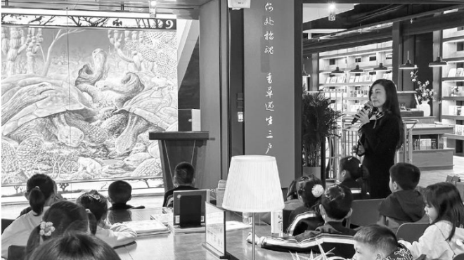 長(zhǎng)江少年兒童出版社金牌講師黃磊在宜昌屈原書城給孩子們講解繪本故事。宜昌新華 供圖