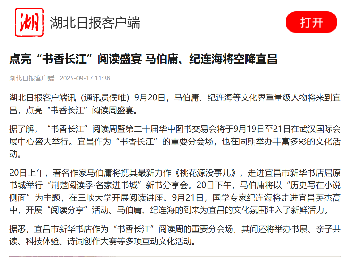 9月20日,馬伯庸、紀(jì)連海等文化界重量級(jí)人物將來(lái)到宜昌,點(diǎn)亮“書香長(zhǎng)江”閱讀周盛宴。