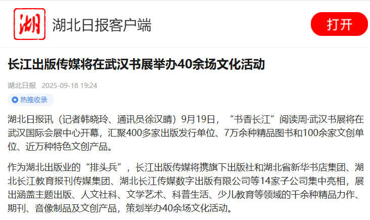 湖北日報客戶端 | 長江出版?zhèn)髅綄⒃谖錆h書展舉辦40余場文化活動