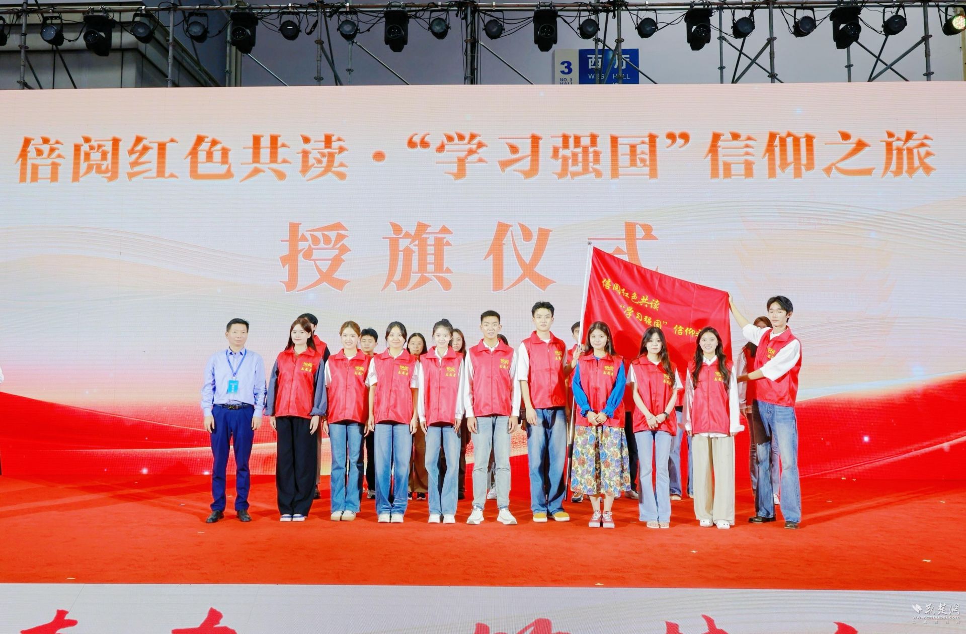 省委講師團(tuán)主任姚亭華向大學(xué)生代表授予“紅色共讀·信仰之旅”旗幟,象征紅色精神薪火相傳。