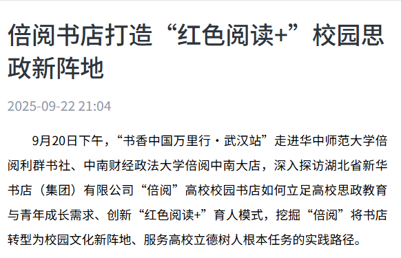 9月20日下午,“書(shū)香中國(guó)萬(wàn)里行?武漢站”走進(jìn)華中師范大學(xué)倍閱利群書(shū)社、中南財(cái)經(jīng)政法大學(xué)倍閱中南大店,深入探訪湖北省新華書(shū)店(集團(tuán))有限公司“倍閱”高校校園書(shū)店如何立足高校思政教育與青年成長(zhǎng)需求、創(chuàng)新“紅色閱讀+”育人模式,挖掘“倍閱”將書(shū)店轉(zhuǎn)型為校園文化新陣地、服務(wù)高校立德樹(shù)人根本任務(wù)的實(shí)踐路徑。