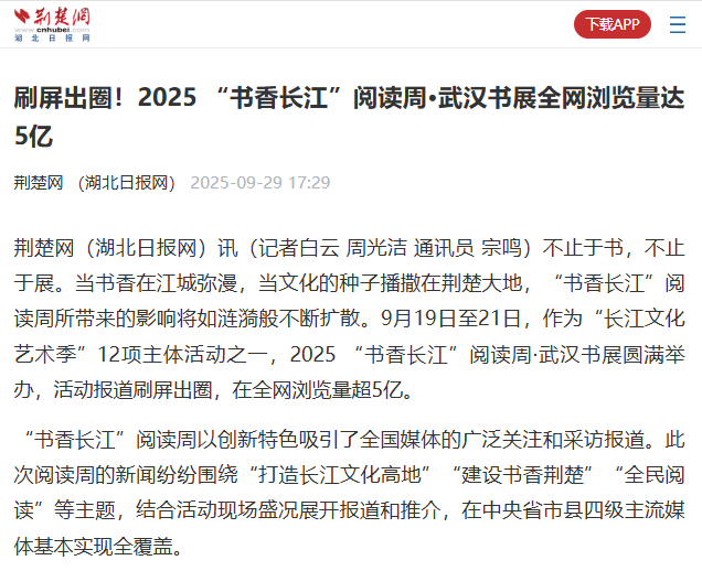 荊楚網(wǎng) | 刷屏出圈!2025 “書香長江”閱讀周·武漢書展全網(wǎng)瀏覽量達5億