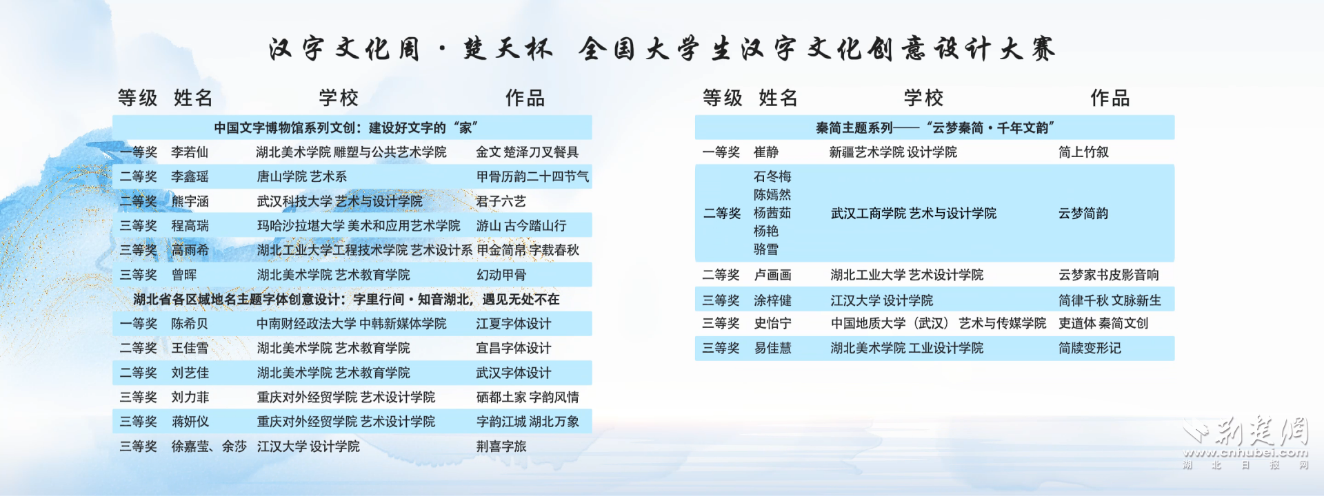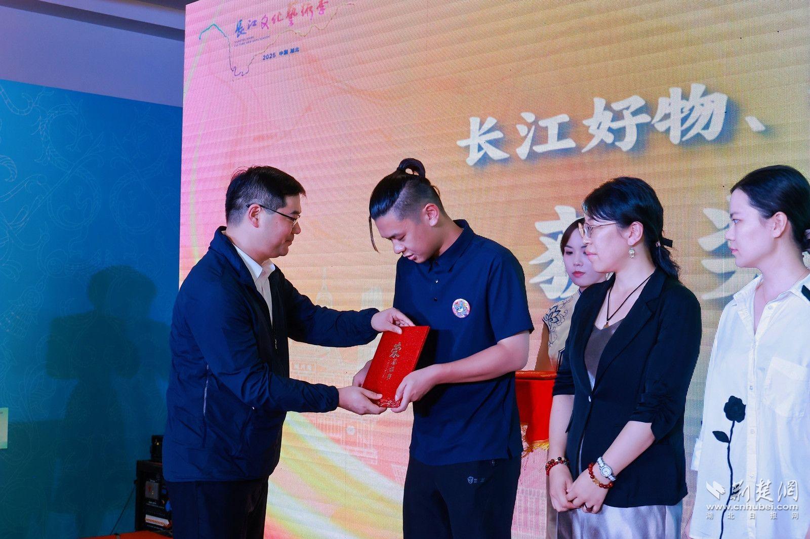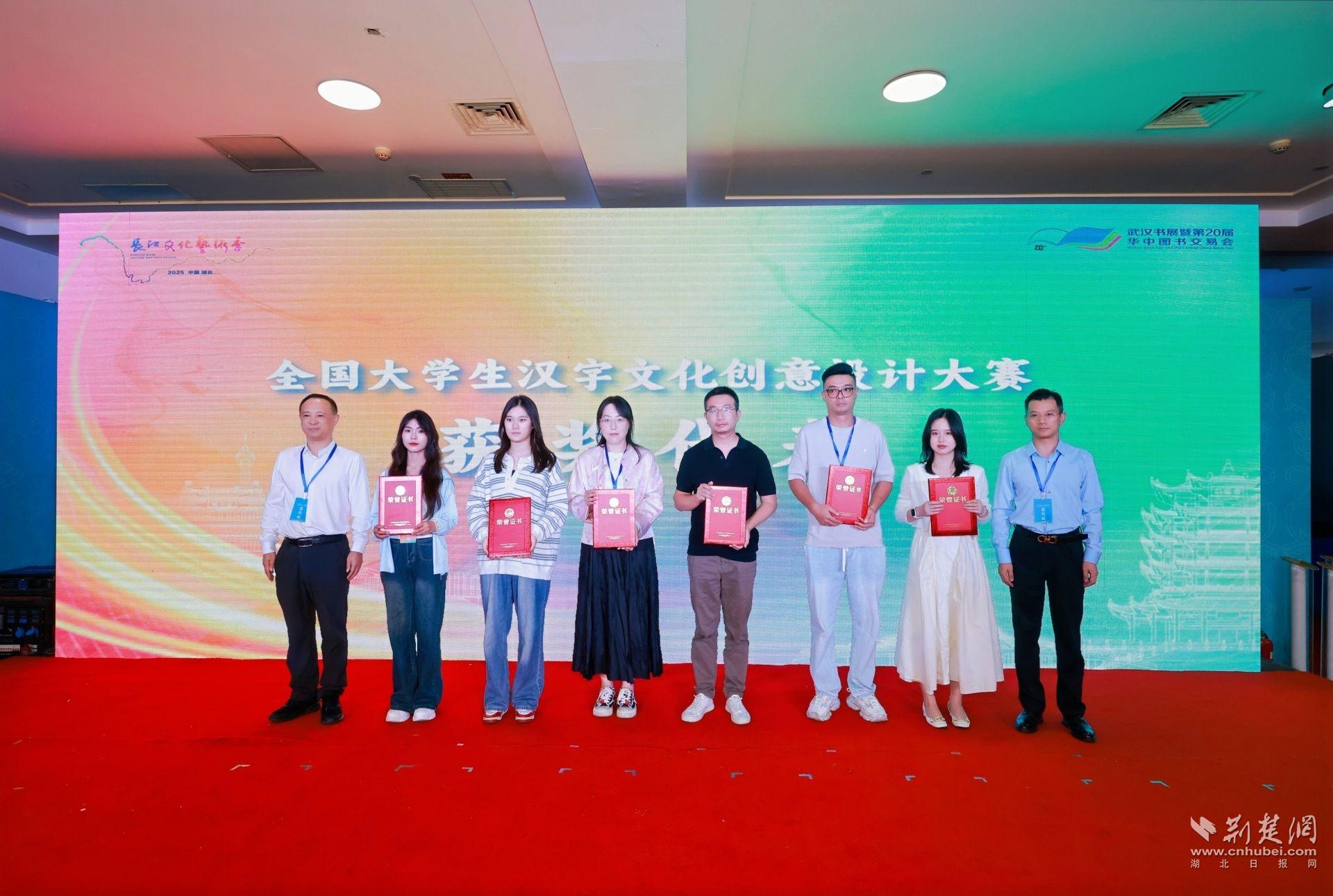 活動現場,首屆“漢字文化周·楚天杯”全國大學生文化創(chuàng)意設計大賽和“長江好物系列評選”的獲獎作品發(fā)布與頒獎環(huán)節(jié)備受矚目。湖北省新華書店(集團)有限公司黨委委員、副總經理柏濤、漢字文化周活動組委會主任楊文博為大學生大賽獲獎者頒獎,年輕創(chuàng)作者們以創(chuàng)新思維融合漢字文化與現代設計,展現無限創(chuàng)意潛力;中國出版?zhèn)髅缴虉笊绺笨偨浝砟叱?、湖北省曲藝家協會主席陸鳴為“長江好物”獲獎單位和個人頒獎。獲獎作品涵蓋多個領域,體現長江流域文化內涵與藝術魅力,為產業(yè)發(fā)展樹立標桿。